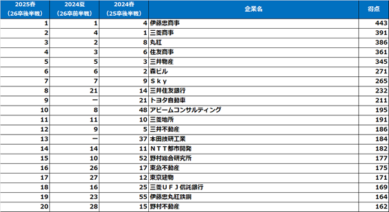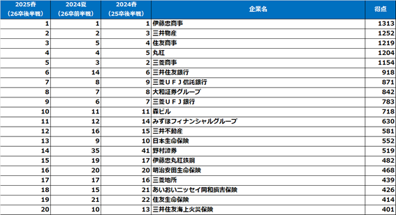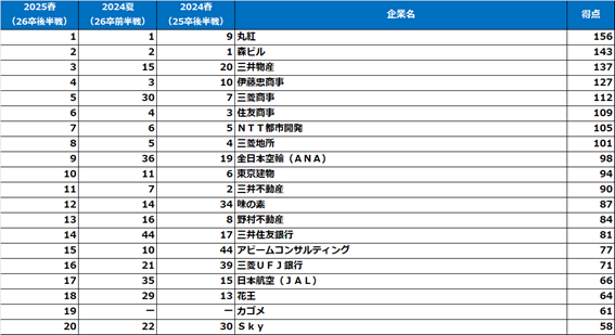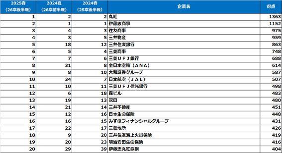 参考に、同社が行った「2025年春(2026卒就活後半戦調査)大学生が選んだ就職人気企業ランキング」と比較してみましょう。