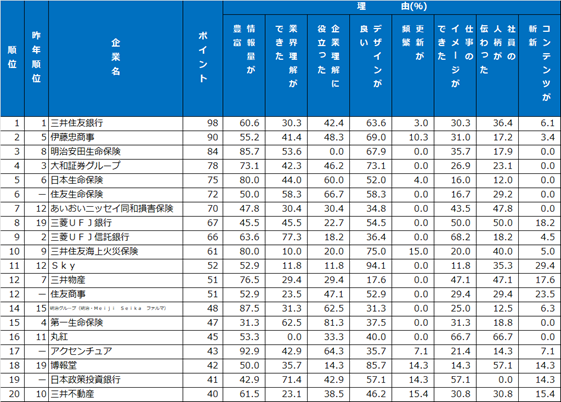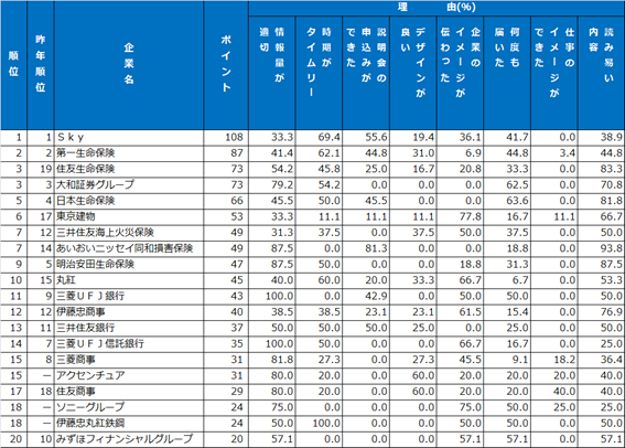 2位の明治安田生命保険は「読みやすく、実際の仕事や経営理念などコンパクトに情報が詰まっていた」と「デザイン」に加えて「情報量」でも支持されました。両社ともに「自宅に冊子を郵送してくれた」といったコメントも寄せられており、丁寧な情報発信姿勢も学生の琴線に触れたようです。