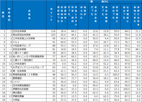 インターンシップ・ランキング2年連続1位の日本生命保険は「5日間かけて実際に仕事を体験でき、理解が深まった」と「仕事理解」で評価されたほか、「参加しやすい時期・期間」でも評価されました。「グループ作業が多く楽しかった」と学生の満足度は高いようです。 2位の明治安田生命保険も「業界や仕事についての理解はもちろん、志望する部署の方に直接話を聞けて働くことへのイメージが明確になった」と「業界理解」や「仕事理解」での評価が目立ちました。