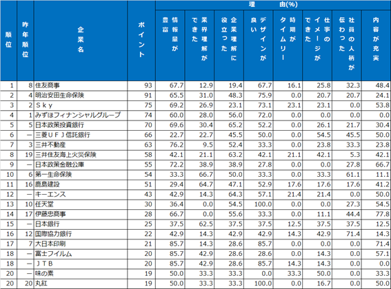 パンブレット・ランキング1位の住友商事は「デザインが良かった。オフィスの写真やさまざまな年代の社員の方へのインタビューなど内容も充実していた」と「デザイン」と「情報量」が高く評価されています。
