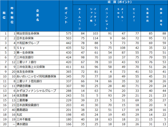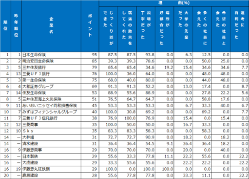 2位の日本生命保険も「インターンシップ類」「先輩社員・懇談会部門」で1位となったほか、「選考・面接部門」で2位、「セミナー・説明会」部門で4位、「ホームページ」「メール・SNS」で5位にランクイン。