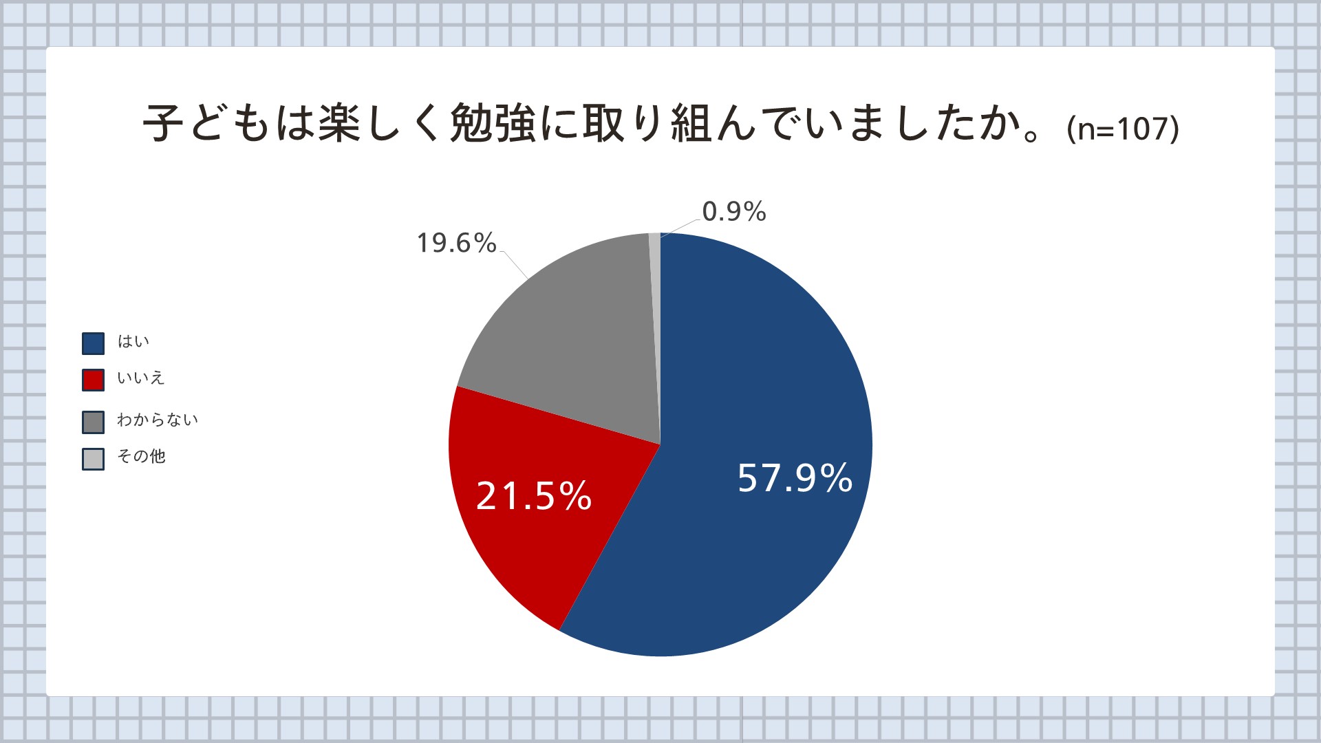 こうしたサポートや環境づくりもあってか、57.9%の保護者が「子どもは楽しく勉強に取り組んでいた」と回答しました。