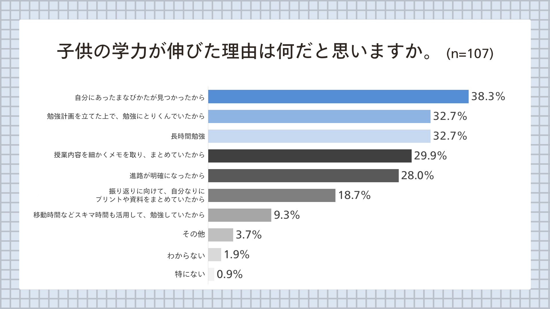 さらに、「子どもの学力が伸びた一番の理由」を聞いたところ、最多の回答は「自分にあったまなびかたが見つかったから(38.3%)」で、自分にあった“まなびかた”を見つけ、楽しく勉強することが、合格につながっていることが伺えました。