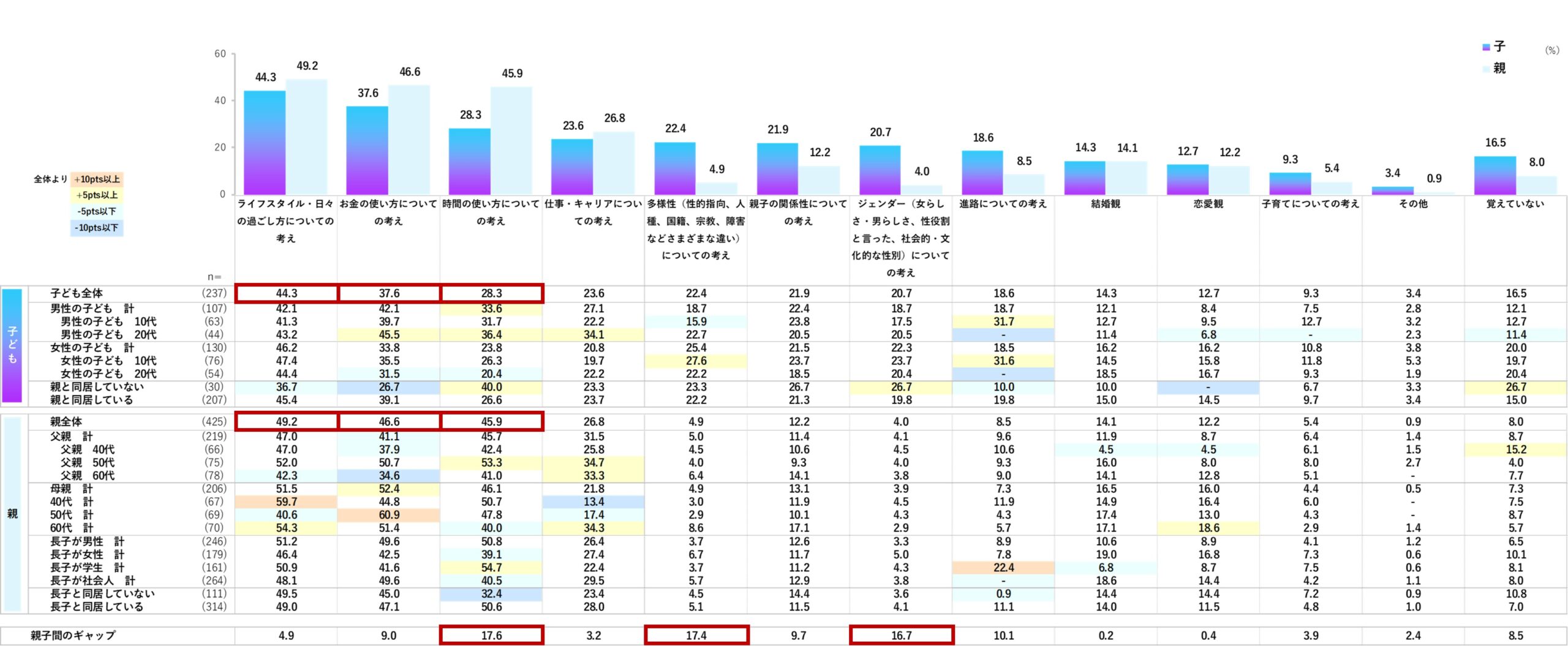 具体的に価値観の違いを感じているのは、Z世代の子ども⇒親では「ライフスタイル・日々の過ごし方についての考え」が44.3%でトップ。次いで「お金の使い方についての考え」が37.6%、「時間の使い方についての考え方」が28.3%と続きます。上位4つは親⇒Z世代の子どもでも同様の項目が並んでいます。