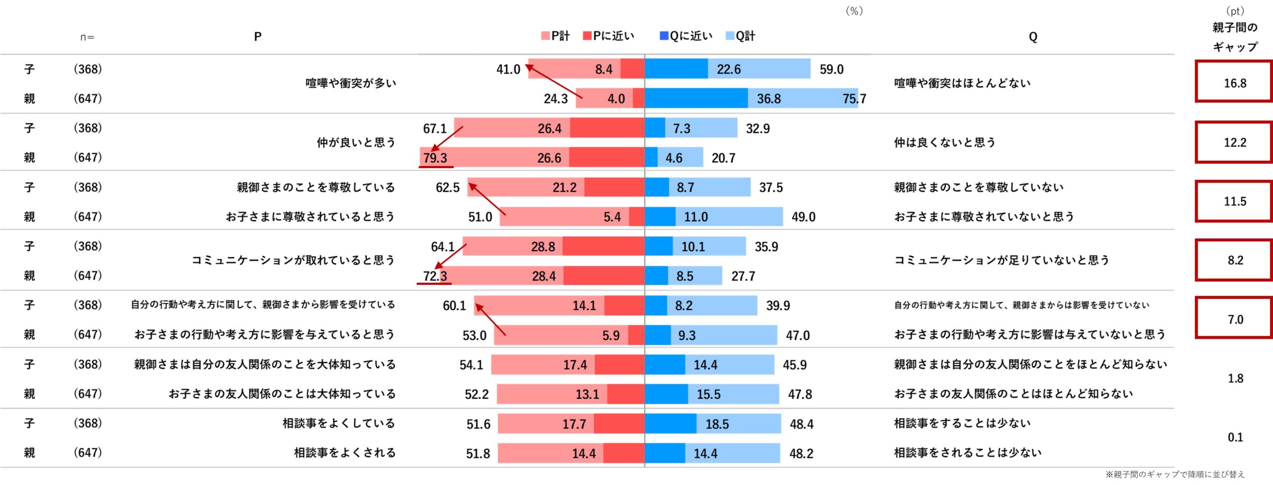 親子間の世代で最もギャップが出たのは、16.8pt差の「喧嘩や衝突の有無」で、Z世代の子どもは4割が喧嘩や衝突が多いと感じているのに対し、親は2割強にとどまりました。