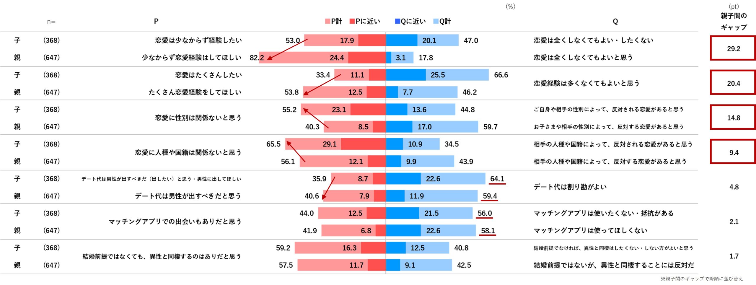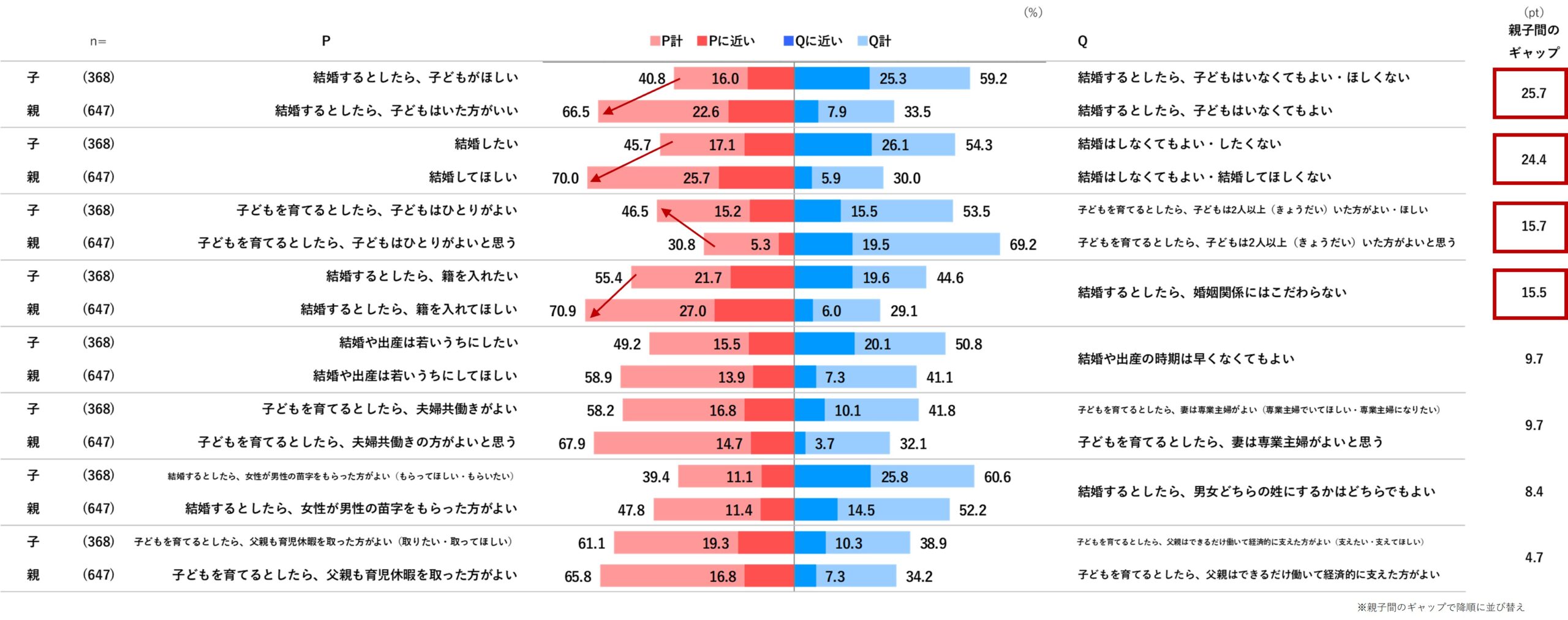 親子間のギャップは「恋愛経験の有無」で29.2pt、次いで「子有無」で25.7pt、「結婚有無」の24.4ptとZ世代はいずれに対しても消極的な模様です。恋愛における性別や人種・国籍、婚姻関係にこだわらない結婚等でも親子間でギャップがあり、Z世代の方がライフイベントに関してステレオタイプに縛られず、柔軟な考えをしているようです。