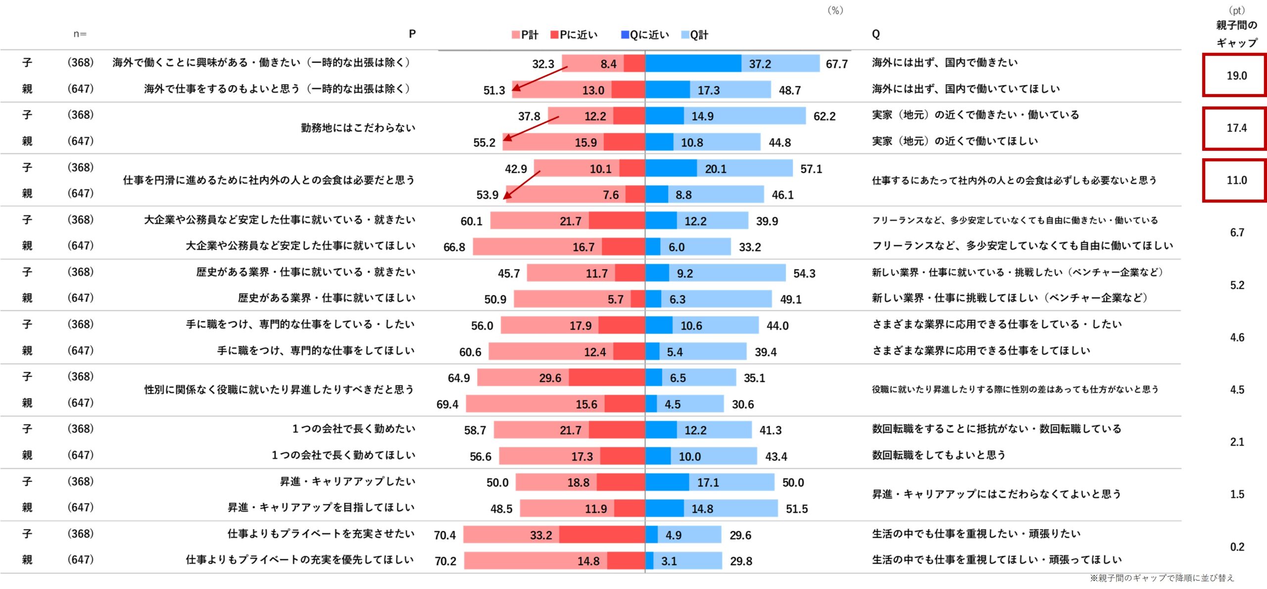 仕事・キャリアについての考えは、他のテーマと比較して親子間のギャップが少ない結果にはなりましたが、ギャップが大きかったのは勤務地についてで、Z世代は海外勤務に興味がある人は3割程度にとどまり、実家(地元)近くで働きたい人が6割以上と就職意識に関して地元志向である様子がわかりました。また、社内外の人との会食の必要性でも親子間でのギャップが出ており、Z世代は業務外の交流と捉え、慎重な姿勢が見られます。