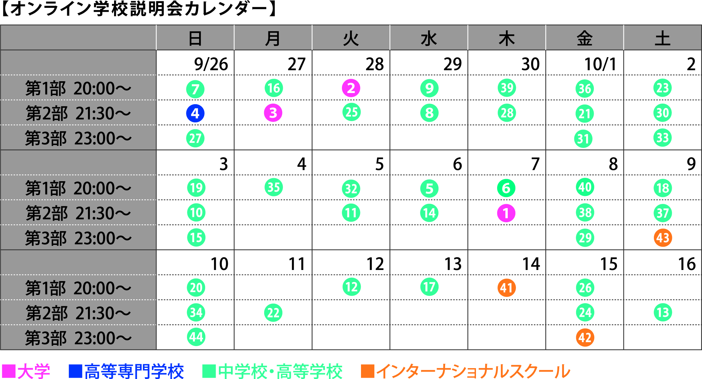 | 日時 | 2021年9月26日(日)~10月16日(土) 時間 アメリカ東部時間 第1部 20:00~ 第2部 21:30~ 第1部 23:00~※時差により上記以外の各国・地域で開催時間が異なります。例えば第一部は、日本時間では上記の翌日9:00~、東アジアでは上記の翌日8:00~、東南アジアでは上記の翌日7:00~となります。※開催時間は1時間を想定しておりますが、状況により1時間を超える場合もございます。※詳細は各学校のスケジュールをご参照ください |