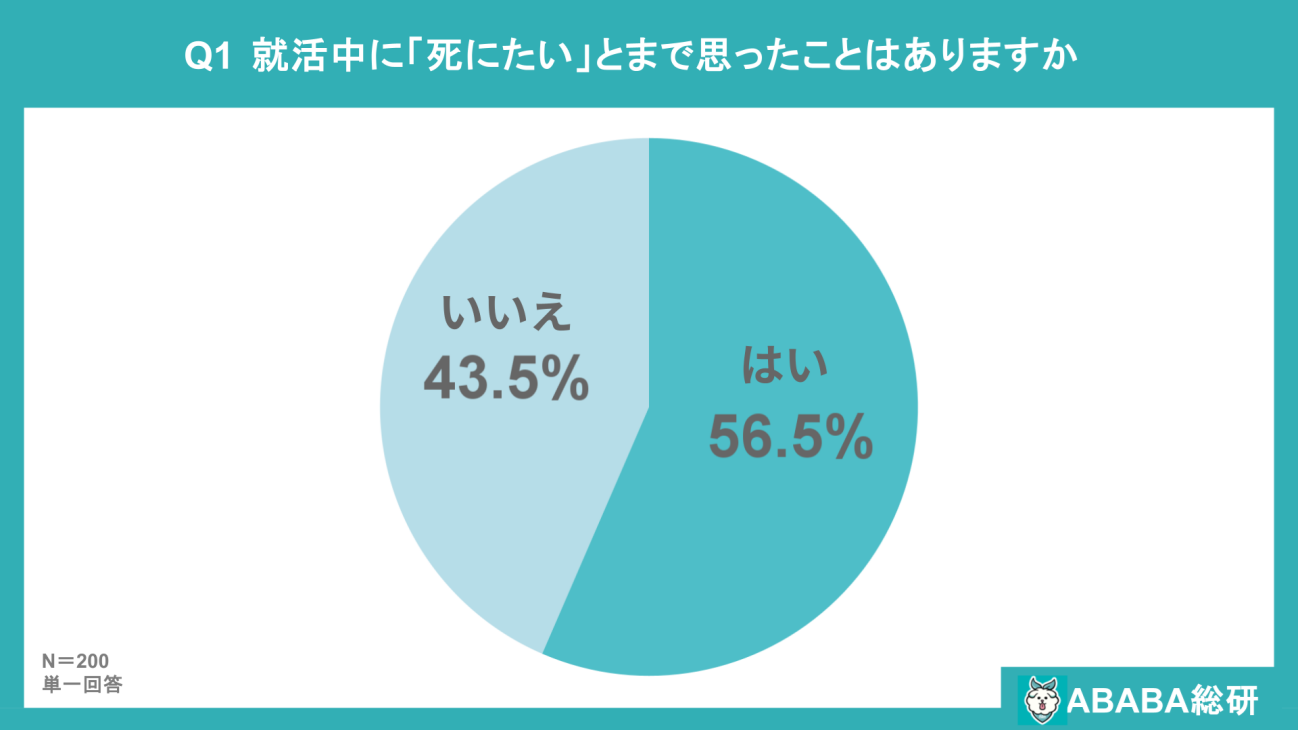 就活うつを自覚したという学生に「就活中に死にたいとまで思ったことはありますか?」と聞くと、56.5%が「ある」と回答しました。半数以上が、命を絶ちたいと思うほどの深刻な精神状態であったことがわかりました。