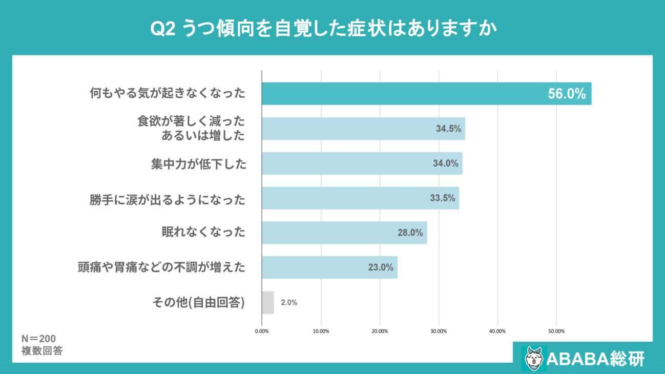 就活中にうつ傾向を自覚した症状について尋ねたところ、「なにもやる気が起きなくなった」が56%で最も多く、半数以上が意欲の低下を経験していることがわかりました。