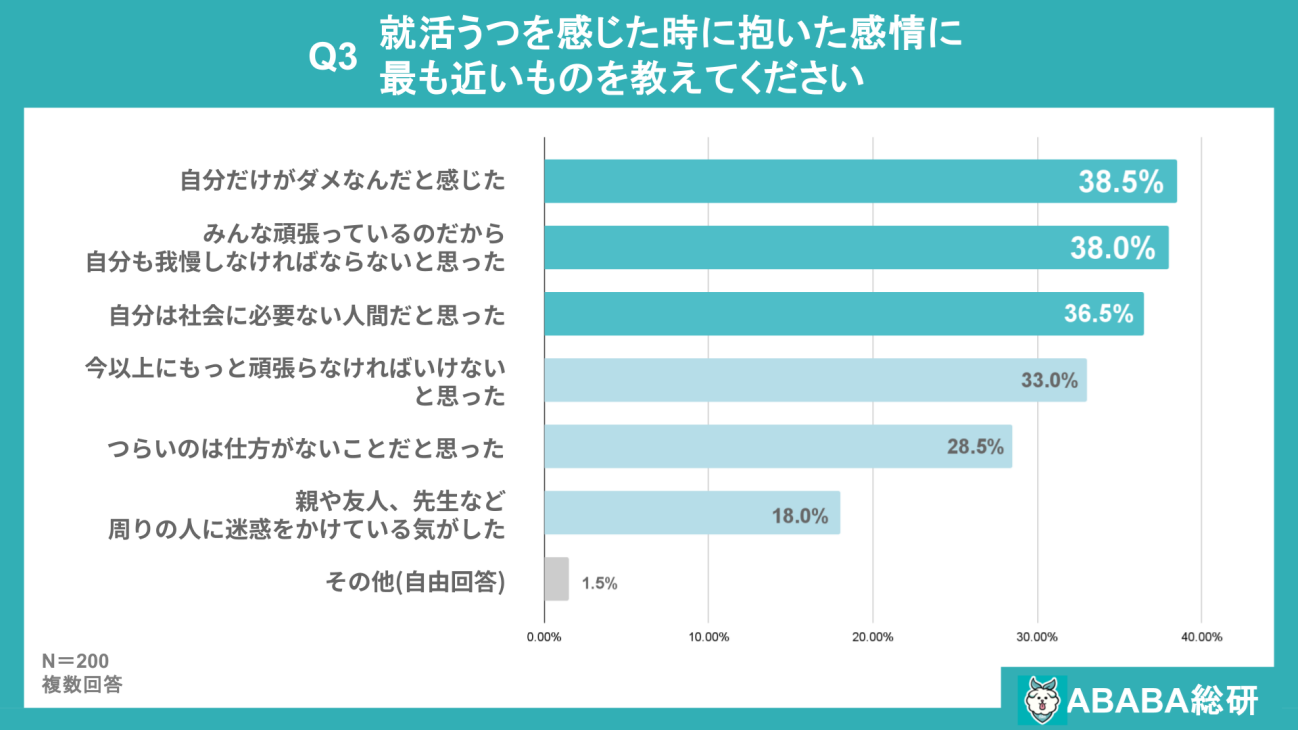 就活うつを感じたときの感情を尋ねたところ、「自分だけがダメなんだと思った」が38.5%で最多となりました。次いで「みんな頑張っているのだから、自分も我慢しなければならないと思った」が38%、「自分は社会に必要ない人間だと思った」が36.5%と続き、約4割の就活生が自己否定感を抱いていることが明らかになりました。