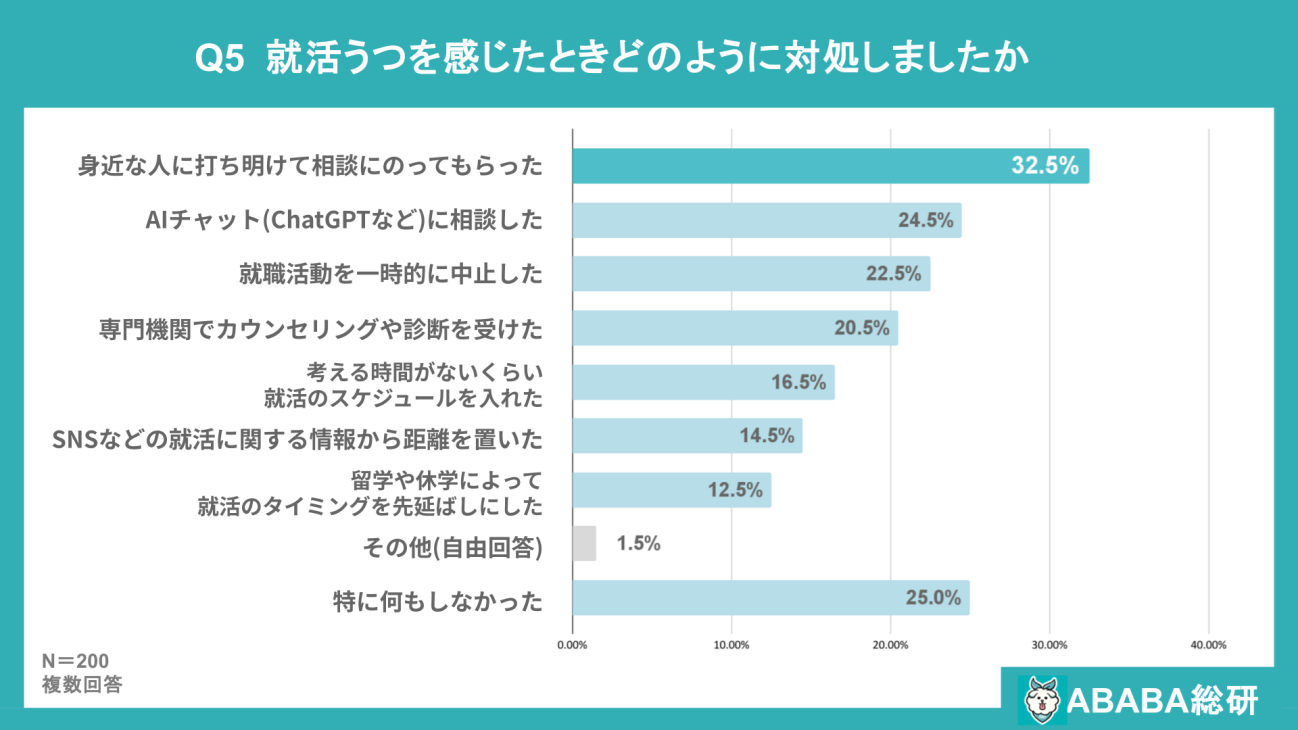 また、「AIチャット(ChatGPTなど)に相談した」が24.5%と2番目に多い対処法で、悩みをAIに打ち明ける学生が約4人に1人いることがわかりました。次いで「就職活動を一時的に中止した」が22.5%、「専門機関でカウンセリングや診断を受けた」が20.5%と続きました。