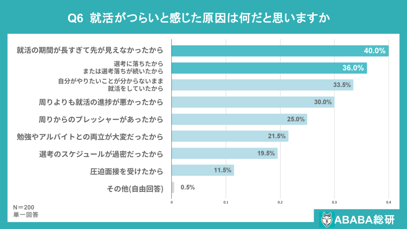 就活がつらいと感じた原因を尋ねたところ、「就活の期間が長すぎて先が見えなかったから」が40%で最多となりました。就活の長期化が学生の精神的負担の最大の要因となっていることがわかります。