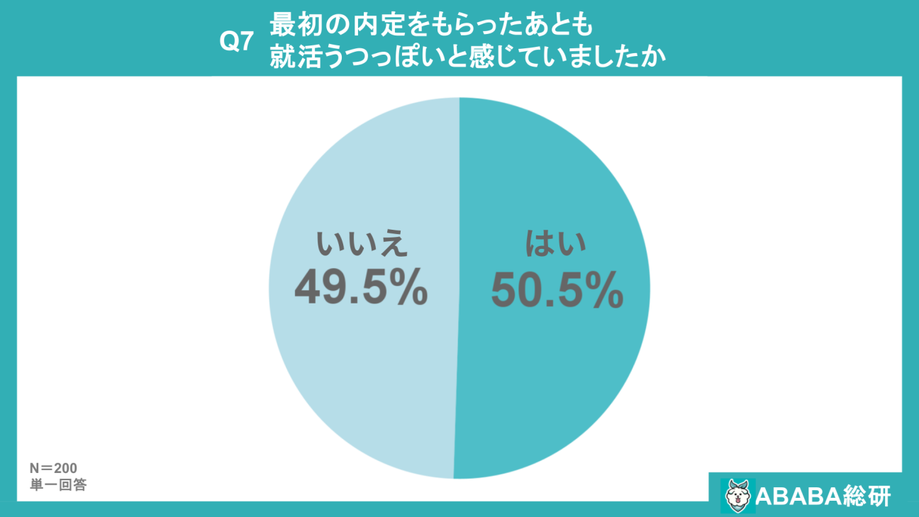 最初の内定をもらった後も就活うつっぽいと感じていたかを尋ねたところ、「はい」という回答が50.5%と半数を超えました。