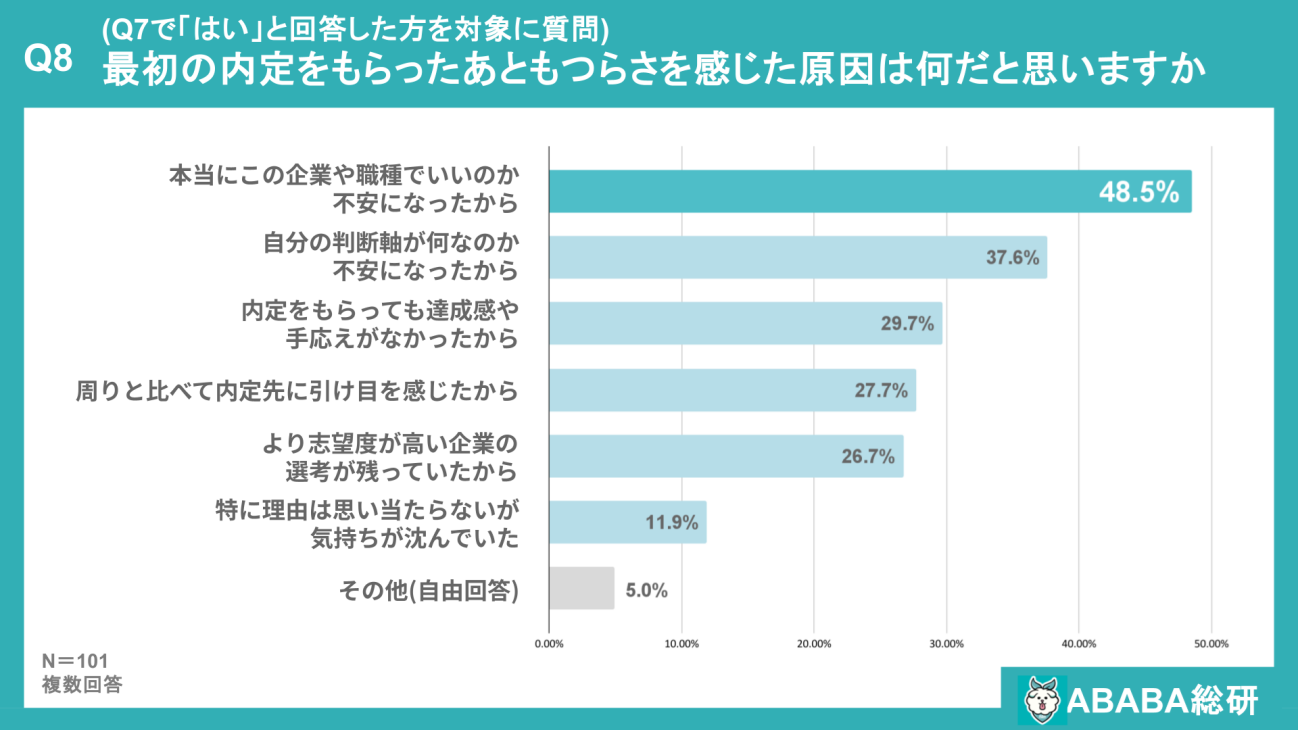 前問で「はい」と回答した方にその原因を尋ねたところ、「本当にこの企業や職種でいいのか不安になったから」が48.5%で最多となりました。内定を獲得してもなお、約半数の学生が自分の選択に確信を持てず、不安を抱え続けている実態が明らかになりました。