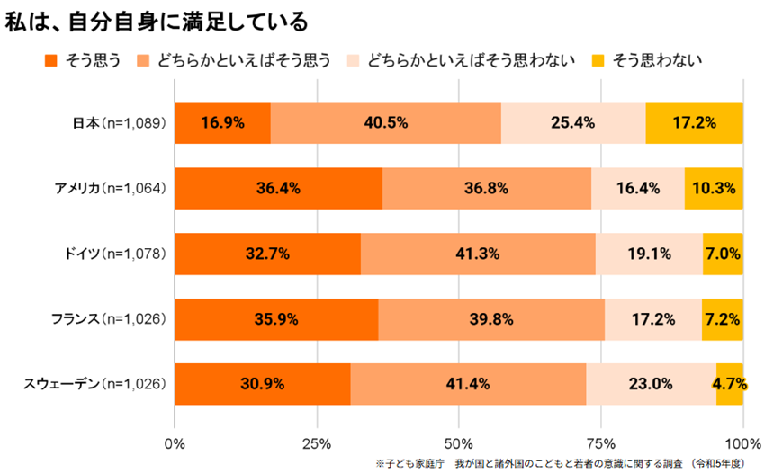 近年、日本の子どもの自己肯定感の低さが社会課題となっています。こども家庭庁が2024年に発表した調査では「自分に満足している」と答えた子どもの割合は、下のグラフの通り、諸外国に比べ低い水準にあります。果たして「ほめる」と「写真」でそれを改善できるのでしょうか? 調査結果を見てみましょう。