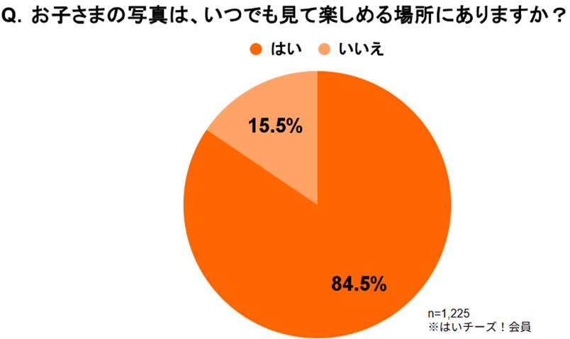 子どもの写真がいつでも見て楽しめる場所にあるかどうかを聞くと、「ある」と回答したのは84.5%でした。