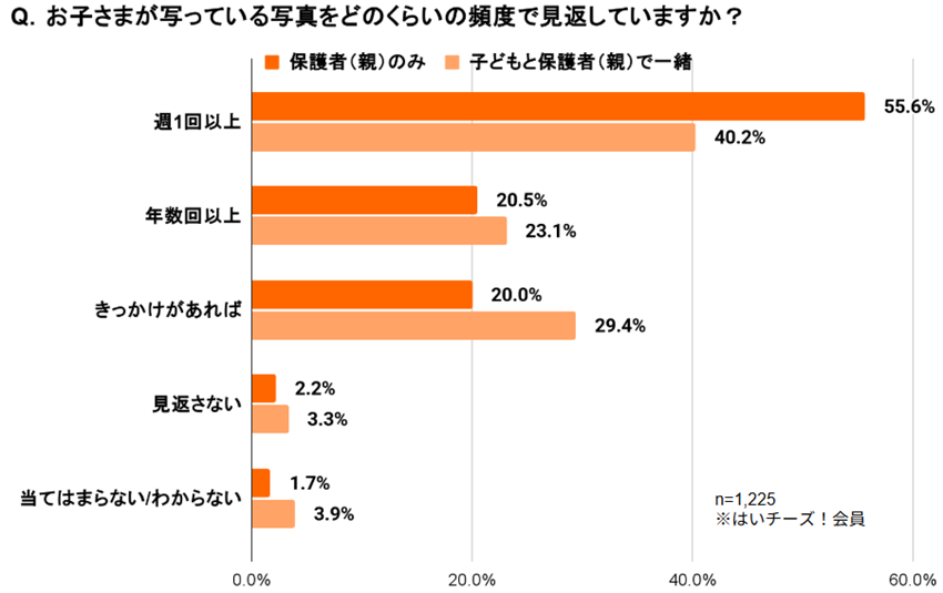 写真を見返す頻度については「保護者(親)のみ」では週1回以上が55.6%と半数を超えた一方、「子どもと保護者(親)で一緒」では40.2%に減少。写真は保護者自身の楽しみになりがちで、親子で共有する機会が意外に少ないことが分かりました。