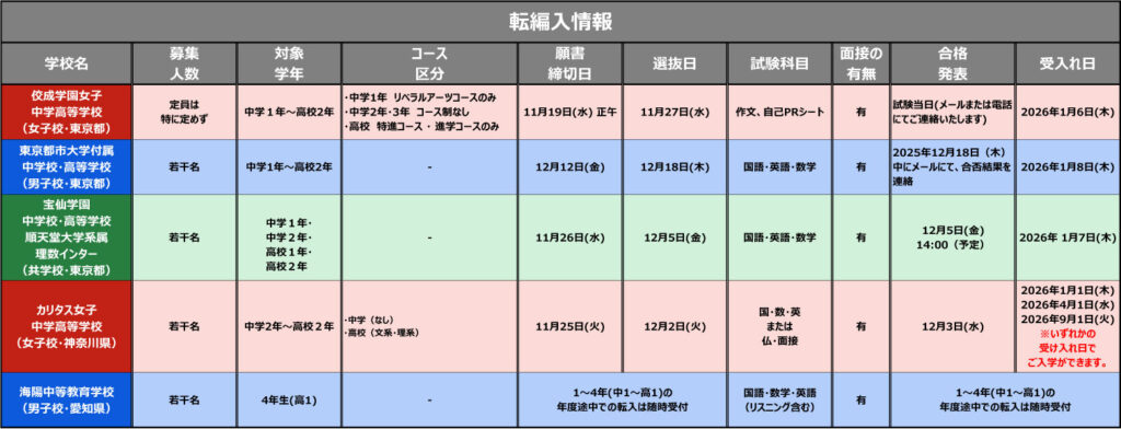 転・編入試験を実施していない学校もあれば、実施していても学年や募集時期が限られている場合があり、本帰国前の多忙な時期に様々な学校のホームページで募集の有無を確認するのは大変かと思います。